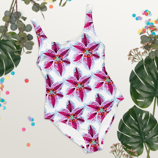 Tiger Lily Floral Pattern One-Piece Bathing Suit, Sexy Plus Size Beach Swimsuit, Festival Bodysuit