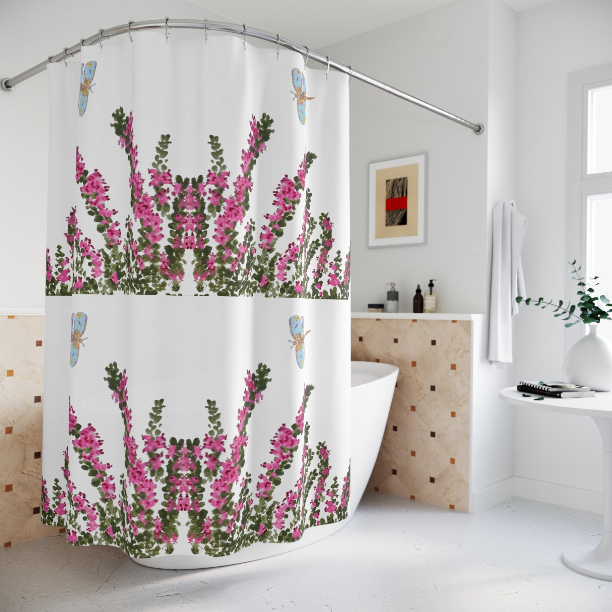 Heather Flower Patterned Shower Curtains, Nature Inspired Printed Floral Bath Curtain, Dragonfly Botanical Bathroom Decor