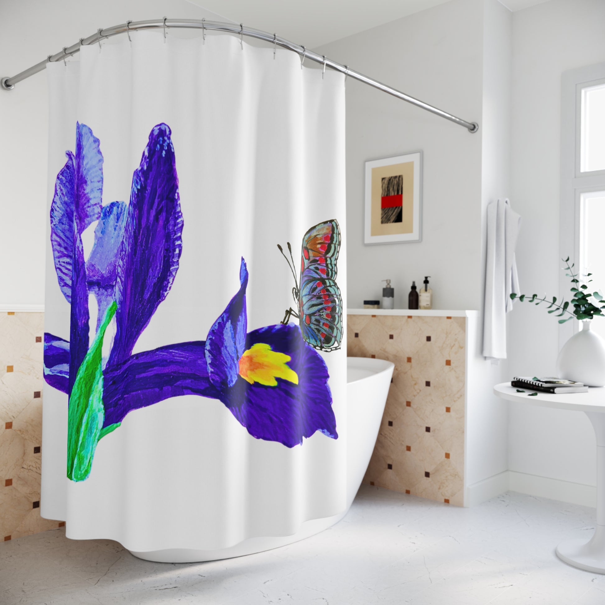 Monarch on Iris Flower Shower Curtain, Botanical Bathroom Decor, Printed Floral Shower Curtain, Bathroom Refresh Gift